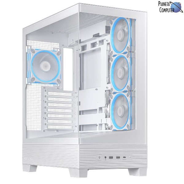 Case per PC ASUS A31 PLUS ATX, disponibile in versione nera o bianca, progettato per offrire una configurazione pulita ed elegante grazie al supporto per schede madri con connettori nascosti e a un’accurata gestione dei cavi, dotato di quattro ventole ARGB preinstallate per un raffreddamento ottimale e un impatto visivo accattivante, supporta l’installazione di radiatori fino a 360 mm di lunghezza e ventole fino a 80 mm di spessore, compatibile con schede grafiche fino a 380 mm di lunghezza e dissipatori ad aria per CPU con altezza massima di 165 mm, la struttura include un pannello laterale e uno frontale in vetro temperato per una vista completa e continua sull’interno del case e sui componenti, design panoramico pensato per valorizzare le configurazioni RGB e l’estetica hardware, base inclinata di 8° che migliora la circolazione dell’aria e offre una visione angolata più immersiva dei componenti, vano posteriore alla scheda madre con larghezza di 34 mm per una gestione efficiente dei cavi e una costruzione ordinata, cavi I/O interni coordinati nel colore (bianchi o neri) in base alla versione scelta per un’estetica uniforme, struttura pensata per mantenere l’interno privo di ingombri e facilitare il montaggio di componenti di fascia alta senza compromettere l’ordine interno, I/O frontale dotato di connettività moderna con porte USB e audio per il collegamento rapido di periferiche e dispositivi.