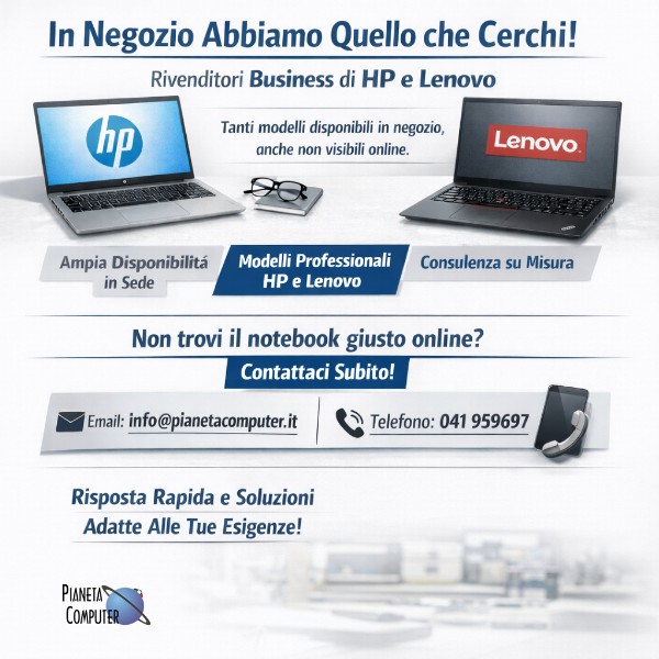 Nel nostro catalogo online trovi una selezione di notebook rappresentativa delle principali proposte attualmente disponibili, ma non l’intera disponibilità reale del negozio. Pianeta Computer opera a Mestre dal 1998 e da anni è rivenditore delle linee business di HP e Lenovo, marchi che trattiamo con continuità sia per clientela privata sia per aziende. In particolare, le serie professionali vengono spesso gestite direttamente in negozio, dove possiamo verificarne configurazioni, disponibilità, eventuali varianti e tempi di approvvigionamento.