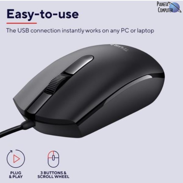 Il mouse Trust TM-101 è un dispositivo cablato con connessione USB 2.0 e cavo di 160 cm, compatibile con laptop e PC, progettato per essere utilizzato da utenti mancini e destri grazie al suo design ambidestro, senza illuminazione e senza opzioni di click silenzioso. Dotato di 3 pulsanti, incluso uno integrato nella rotellina per scrolling a trama, e sensore ottico con risoluzione di 1200 DPI, adatto a superfici piane non riflettenti, per un utilizzo versatile su varie superfici. Le dimensioni del prodotto sono 116 mm di lunghezza, 63 mm di larghezza e 38 mm di altezza, con un peso di 83 g, in un formato standard non ergonomico. Il mouse non presenta funzionalità di DPI regolabile, pulsanti programmabili o pesi aggiustabili, ed è alimentato tramite porta USB. È compatibile con Windows 10, 11, macOS 10.15, 11, 12, e Chrome OS. Codice articolo 24274, EAN 8713439242744, con una garanzia di 2 anni. Contenuto della confezione: mouse a filo.