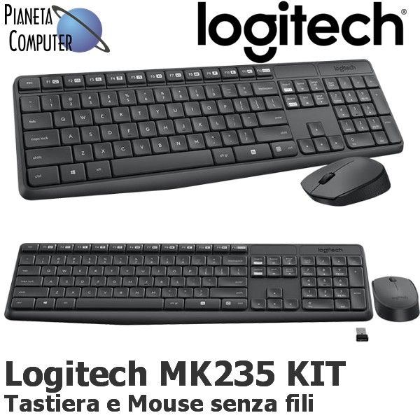 Logitech Kit Tastiera e Mouse Wireless Combo MK235 – Colore Nero – Tecnologia Wireless avanzata a 2,4GHz. Tastiera senza fili estesa con tastierino numerico e batteria che durano fino a 36 mesi. Mouse senza fili con durata batterie fino a 12 mesi. Distanza segnale fino a 10 metri. Ricevitore nano USB compatto. Comodissima e semplce da utilizzare, il kit tastiera e mouse Logitech MK235 è il completamento ideale per il tuo computer, notebook o tablet PC